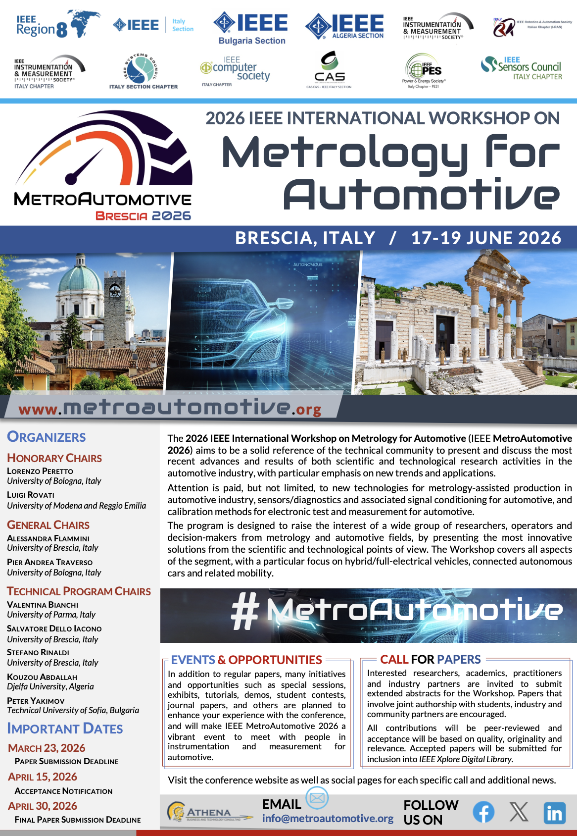The 2026 IEEE International Workshop on Metrology for Automotive (IEEE MetroAutomotive 2026) aims to be a solid reference of the technical community to present and discuss the most recent advances and results of both scientific and technological research activities in the automotive industry, with particular emphasis on new trends and applications.